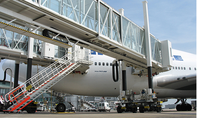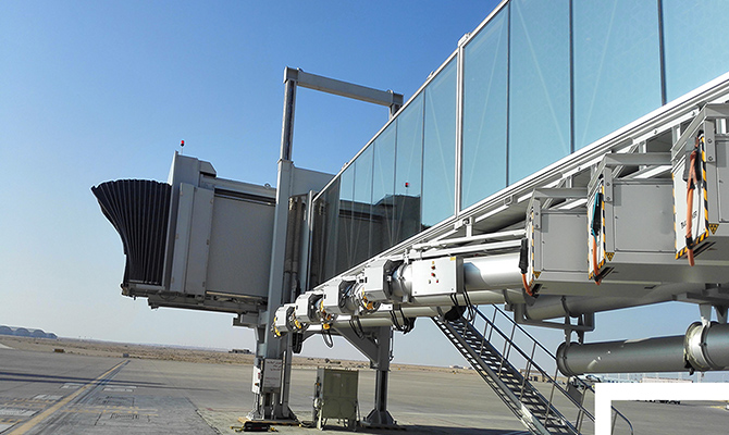 The main components of the L-shaped horizontally-shifting telescopic passenger boarding bridge are: joint building, rear door frame, side-by-shore telescopic road, front door frame, land side lifting mechanism, vertical bank expansion channel, sea side lifting mechanism, walking mechanism, and ship receiving Mouth, repair ladder, etc. Compared with other forms of boarding bridges, the L-shaped transverse boarding bridge has a wider range of activities and a wider adaptability, which can adapt to different parking positions. The traveling mechanism is an orbital overall traverse, driving the boarding bridge to achieve horizontal movement in parallel with the waiting ship building on the platform; 2 sets of lifting mechanism enable the boarding bridge to achieve height direction movement, so that the ship receiving port and the service The various cruise door doors are highly adaptable.A380 boarding bridge -