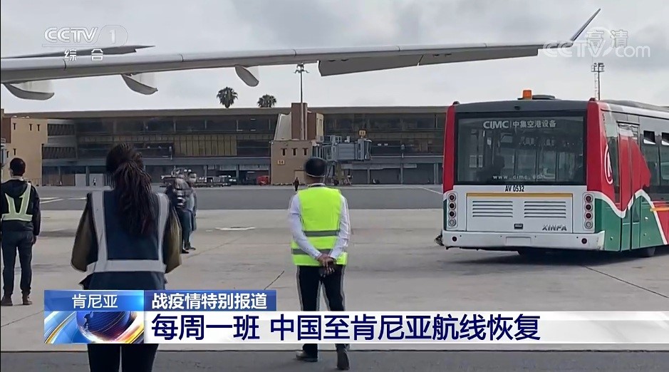 2月27日央視報(bào)道中肯航線恢復(fù),民航協(xié)發(fā)擺渡車正服務(wù)在內(nèi)羅畢機(jī)場