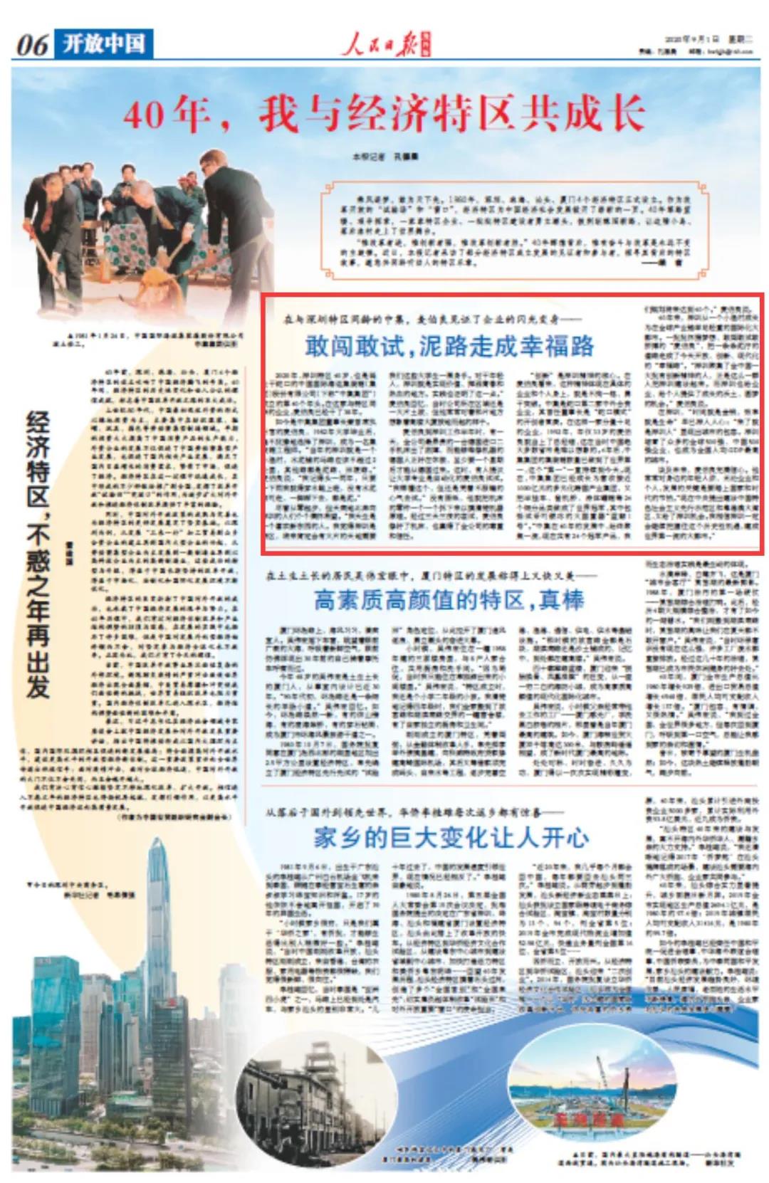 今天,《人民日報海外版》刊登專題報道《40年,我與經濟特區共成長》。該專題報道以三篇文章分別講述了深圳、廈門、汕頭三個經濟特區背后的故事。其中,第一篇就介紹了中集集團董事長兼CEO麥伯良的經歷。以下內容節選自為《人民日報海外版》專題報道《40年,我與經濟特區共成長》:乘風逐夢,敢為天下先。1980年,深圳、珠海、汕頭、廈門4個經濟特區正式設立。作為改革開放的“試驗場”和“窗口”,經濟特區為中國經濟社會發展掀開了嶄新的一頁。40年篳路藍縷、艱辛探索,一家家特區企業、一批批特區建設者勇立潮頭,披荊斬棘闖新路,讓邊陲小島、落后漁村走上了世界舞臺。“惟改革者進,惟創新者強,惟改革創新者勝。”40年輝煌背后,惟有奮斗與改革是永遠不變的主旋律。近日,本報記者采訪了部分經濟特區成立發展的見證者和參與者,探尋其背后的特區故事,邀您共同聆聽動人的特區樂章。在與深圳特區同齡的中集,麥伯良見證了企業的閃光變身——敢闖敢試,泥路走成幸福路1981年1月24日,中國國際海運集裝箱股份有限公司破土動工。中集集團供圖2020年,深圳特區40歲,也是誕生于蛇口的中國國際海運集裝箱(集團)股份有限公司(下稱“中集集團”)成立的第40個年頭。在這家與特區同齡的企業,麥伯良已經干了38年。如今是中集集團董事長兼首席執行官的麥伯良,1982年大學畢業后,毫不猶豫地選擇了深圳,成為一名集裝箱工程師。“當年的深圳就是一個小漁村,水泥鋪的馬路應該不超過2公里,其他路都是泥路、田埂路。”麥伯良說,“我記得頭一兩年,只要一下雨我就得穿水鞋上班,沒有水泥路可走,一腳踩下去,都是泥。”盡管從零起步,但天南地北奔向深圳的人們個個滿懷希望。“我天生是一個喜歡新東西的人。我覺得深圳是特區,將來肯定會有大片的天地需要我們這些大學生一展身手。對于年輕人,深圳就是實現價值、揮灑青春和熱血的地方。實踐也證明了這一點。”麥伯良回憶,當時公司所在區域還是一大片土坡,但他常常對著那片地方想象著高樓大廈拔地而起的樣子。麥伯良到深圳工作半年時,有一天,全公司最昂貴的一臺德國進口二手機床出了故障,而能夠維修機器的德國人正好在休假,至少要一個星期后才能從德國過來。這時,有人提議讓大學專業是自動化的麥伯良試試。“我哪懂這個,但還是憑著不服輸的心氣去試。”沒有圖紙,他就把機床的零件一個一個拆下來以摸清楚機器原理。經過三天三夜的嘗試,麥伯良修好了機床,也贏得了全公司的尊重和信任。“創新”是深圳精神的核心。在麥伯良看來,這種精神體現在具體的企業和個人身上,就是不拘一格、勇于突破。中集是蛇口第二家中外合資企業,其首任董事長是“蛇口模式”的開創者袁庚。在這樣一家分量十足的企業,1992年,年僅33歲的麥伯良就當上了總經理,這在當時中國絕大多數省市是難以想象的。4年后,中集集團的集裝箱數量已做到了世界第一,這個“第一”一直持續到今天。現在,中集集團已經成長為營收接近1000億元的多元化跨國產業集團,又把半掛車、登機橋、液體罐箱等24個細分品類做成了世界冠軍,其中包括試采可燃冰的大國重器“藍鯨1號”。“中集在40年的發展中,始終聚焦一流,現在共有24個冠軍產品,我們規劃將來達到40個。”麥伯良說。40年來,深圳從一個小漁村成長為在全球產業鏈舉足輕重的國際化大都市。一批批懷揣夢想、敢闖敢試敢拼搏的“麥伯良”,把一條條泥濘的道路走成了今天開放、創新、現代化的“幸福路”。“深圳聚集了全中國一大批有創新精神的人,正是這么一群人把深圳建設起來。而深圳也給企業、給個人提供了成長的沃土、圓夢的機會。”麥伯良說。